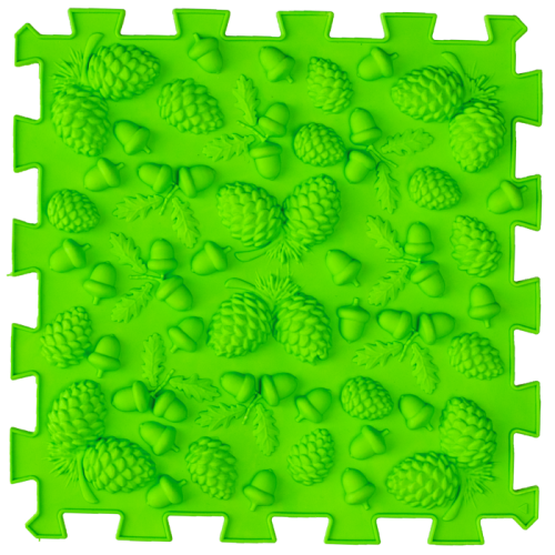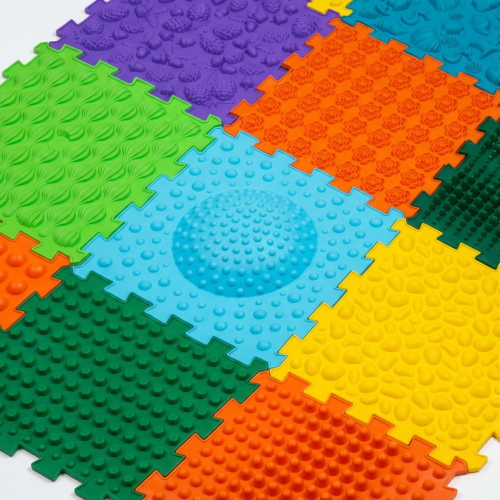 Všetky diely puzzle sú vyrobené z rovnakého materiálu, bezpečného, hypoalergénneho PVC bez škodlivých prísad. Vďaka rozdielnym textúram pôsobí každý diel trochu inak. Tráva, Mušle, Okruhliaky a Hubky patria medzi mäkšie puzzle. Veže, Ježkovia, Morské motívy a Žalude majú strednú tvrdosť. Pyramída, Bodlinky, Lotos a Šišky sú naopak pevnejšie povrchy. Kombinácia modulov s rôznou tvrdosťou vytvára ideálne podmienky na masáž chodidiel, tréning klenby a rozvoj senzorickej integrácie.