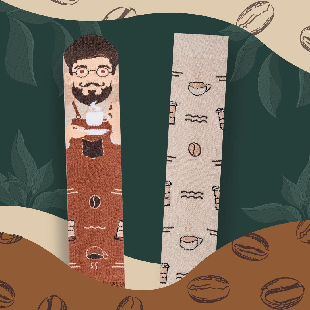 Veselé ponožky Kávoľúbič pre všetkých milovníkov kávy na všetky možné spôsoby. Nechaj sa zlákať originálnym vzorom a nabi sa energiou a dobrou náladou na celý deň. Zrelaxuj pri šálke dobrej kávy s Kávoľúbičom, ktorý ti vďaka 90% obsahu kvalitnej česanej bavlny poskytne maximálne pohodlie. Nemusíš byť barista, barman, ba ani čašník, aby si si mohol vychutnať naše ponožky s motívom kávy naplno:-)
